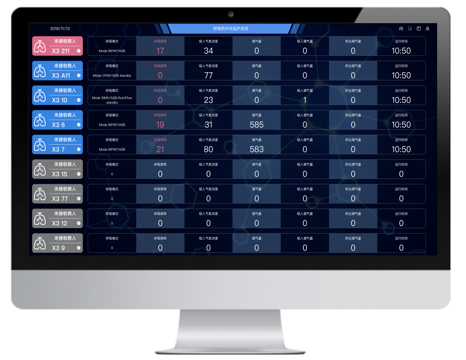 多臺不同品牌的有創(chuàng)呼吸機(jī)聯(lián)網(wǎng),并通過大屏實(shí)時集中呈現(xiàn)治療預(yù)設(shè)參數(shù)和監(jiān)測參數(shù),實(shí)現(xiàn)多臺集中監(jiān)測、集中管理和數(shù)據(jù)存儲。